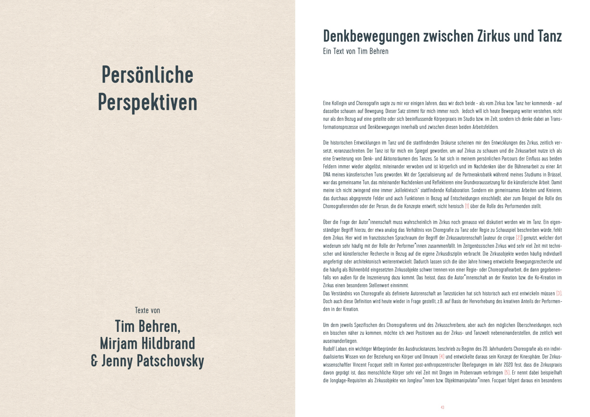Eine Kollegin und Choreografin sagte zu mir vor einigen Jahren, dass wir doch beide - als vom Zirkus bzw. Tanz her kommende - auf dasselbe schauen: auf Bewegung. Dieser Satz stimmt für mich immer noch. Jedoch will ich heute Bewegung weiter verstehen, nicht nur als den Bezug auf eine geteilte oder sich beeinflussende Körperpraxis im Studio bzw. im Zelt, sondern ich denke dabei an Transformationsprozesse und Denkbewegungen innerhalb und zwischen diesen beiden Arbeitsfeldern. Die historischen Entwicklungen im Tanz und die stattfindenden Diskurse scheinen mir den Entwicklungen des Zirkus, zeitlich versetzt, voranzuschreiten. Der Tanz ist für mich ein Spiegel geworden, um auf Zirkus zu schauen und die Zirkusarbeit nutze ich als eine Erweiterung von Denk- und Aktionsräumen des Tanzes. So hat sich in meinem persönlichen Parcours der Einfluss aus beiden Feldern immer wieder abgelöst, miteinander verwoben und ist körperlich und im Nachdenken über die Bühnenarbeit zu einer Art DNA meines künstlerischen Tuns geworden. Mit der Spezialisierung auf die Partnerakrobatik während meines Studiums in Brüssel, war das gemeinsame Tun, das miteinander Nachdenken und Reflektieren eine Grundvoraussetzung für die künstlerische Arbeit. Damit meine ich nicht zwingend eine immer „kollektivisch“ stattfindende Kollaboration. Sondern ein gemeinsames Arbeiten und Kreieren, das durchaus abgegrenzte Felder und auch Funktionen in Bezug auf Entscheidungen einschließt, aber zum Beispiel die Rolle des Choreografierenden oder der Person, die die Konzepte entwirft, nicht heroisch1 über die Rolle des Performenden stellt. Über die Frage der Autor*innenschaft muss wahrscheinlich im Zirkus noch genauso viel diskutiert werden wie im Tanz. Ein eigenständiger Begriff hierzu, der etwa analog das Verhältnis von Choregrafie zu Tanz oder Regie zu Schauspiel beschreiben würde, fehlt dem Zirkus. Hier wird im französischen Sprachraum der Begriff der Zirkusautorenschaft (auteur de cirque2) genutzt, welcher dort wiederum sehr häufig mit der Rolle der Performer*innen zusammenfällt. Im Zeitgenössischen Zirkus wird sehr viel Zeit mit technischer und künstlerischer Recherche in Bezug auf die eigene Zirkusdisziplin verbracht. Die Zirkusobjekte werden häufig individuell angefertigt oder architektonisch weiterentwickelt. Dadurch lassen sich die über Jahre hinweg entwickelte Bewegungsrecherche und die häufig als Bühnenbild eingesetzten Zirkusobjekte schwer trennen von einer Regie- oder Choreografiearbeit, die dann gegebenenfalls von außen für die Inszenierung dazu kommt. Das heisst, dass die Autor*innenschaft an der Kreation bzw. die Ko-Kreation im Zirkus einen besonderen Stellenwert einnimmt. Das Verständnis von Choreografie als definierte Autorenschaft an Tanzstücken hat sich historisch auch erst entwickeln müssen3. Doch auch diese Definition wird heute wieder in Frage gestellt, z.B. auf Basis der Hervorhebung des kreativen Anteils der Performenden in der Kreation. Um dem jeweils Spezifischen des Choreografierens und des Zirkusschreibens, aber auch den möglichen Überschneidungen, noch ein bisschen näher zu kommen, möchte ich zwei Positionen aus der Zirkus- und Tanzwelt nebeneinanderstellen, die zeitlich weit auseinanderliegen. Rudolf Laban, ein wichtiger Mitbegründer des Ausdruckstanzes, beschrieb zu Beginn des 20. Jahrhunderts Choreografie als ein individualisiertes Wissen von der Beziehung von Körper und Umraum4 und entwickelte daraus sein Konzept der Kinesphäre. Der Zirkuswissenschaftler Vincent Focquet stellt im Kontext post-anthropozentrischer Überlegungen im Jahr 2020 fest, dass die Zirkuspraxis davon geprägt ist, dass menschliche Körper sehr viel Zeit mit Dingen im Probenraum verbringen5. Er nennt dabei beispielhaft