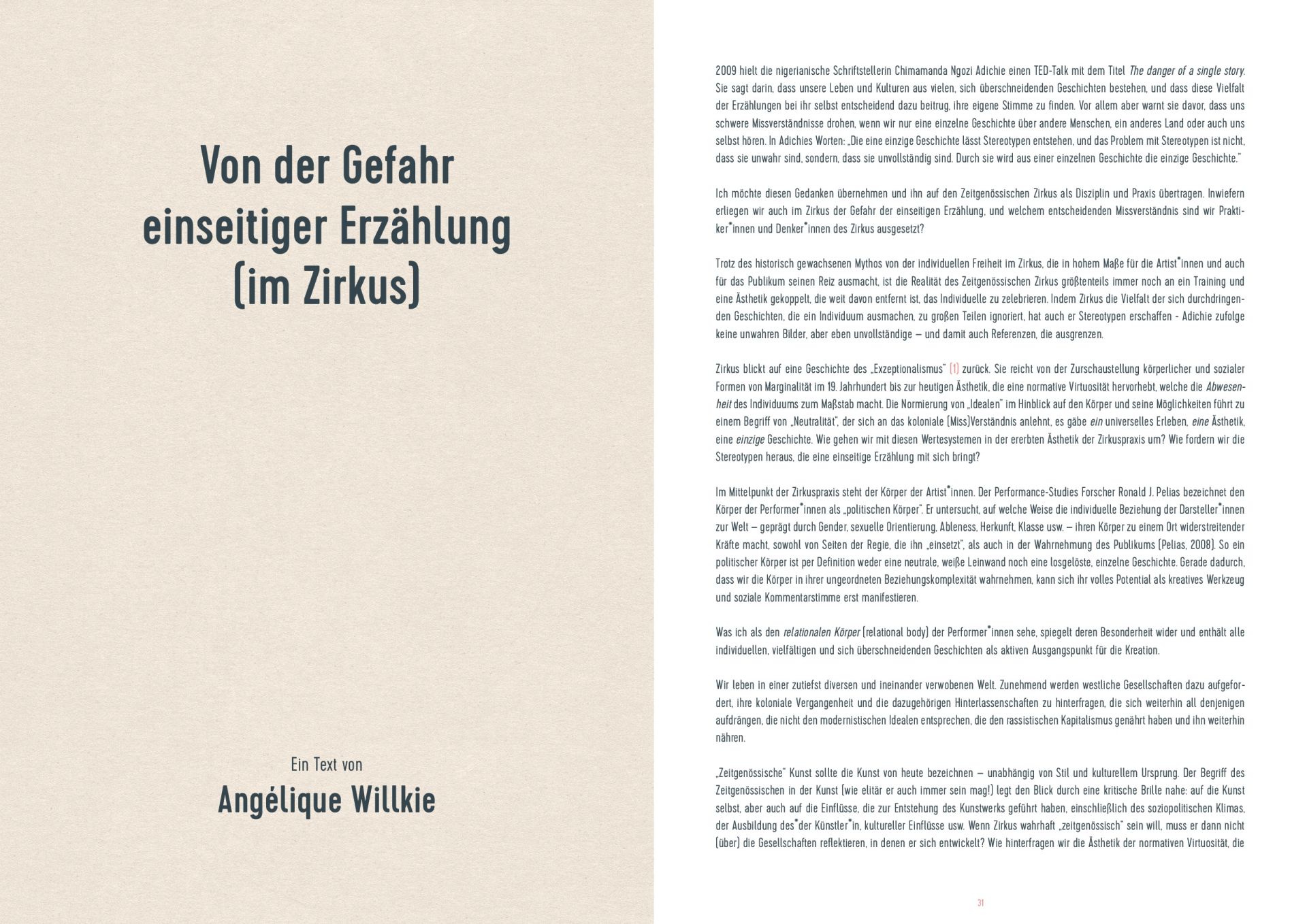 Trotz des historisch gewachsenen Mythos von der individuellen Freiheit im Zirkus, die in hohem Maße für die Artist*innen und auch für das Publikum seinen Reiz ausmacht, ist die Realität des zeitgenössischen Zirkus größtenteils immer noch an ein Training und eine Ästhetik gekoppelt, die weit davon entfernt ist, das Individuum hervorzuheben. Indem Zirkus die Vielfalt der sich durchdringenden Geschichten, die ein Individuum ausmachen, zu großen Teilen ignoriert, hat auch er Stereotype erschaffen - Adichie zufolge keine unwahren Bilder, aber eben unvollständige – und damit auch Referenzen, die ausgrenzen.
