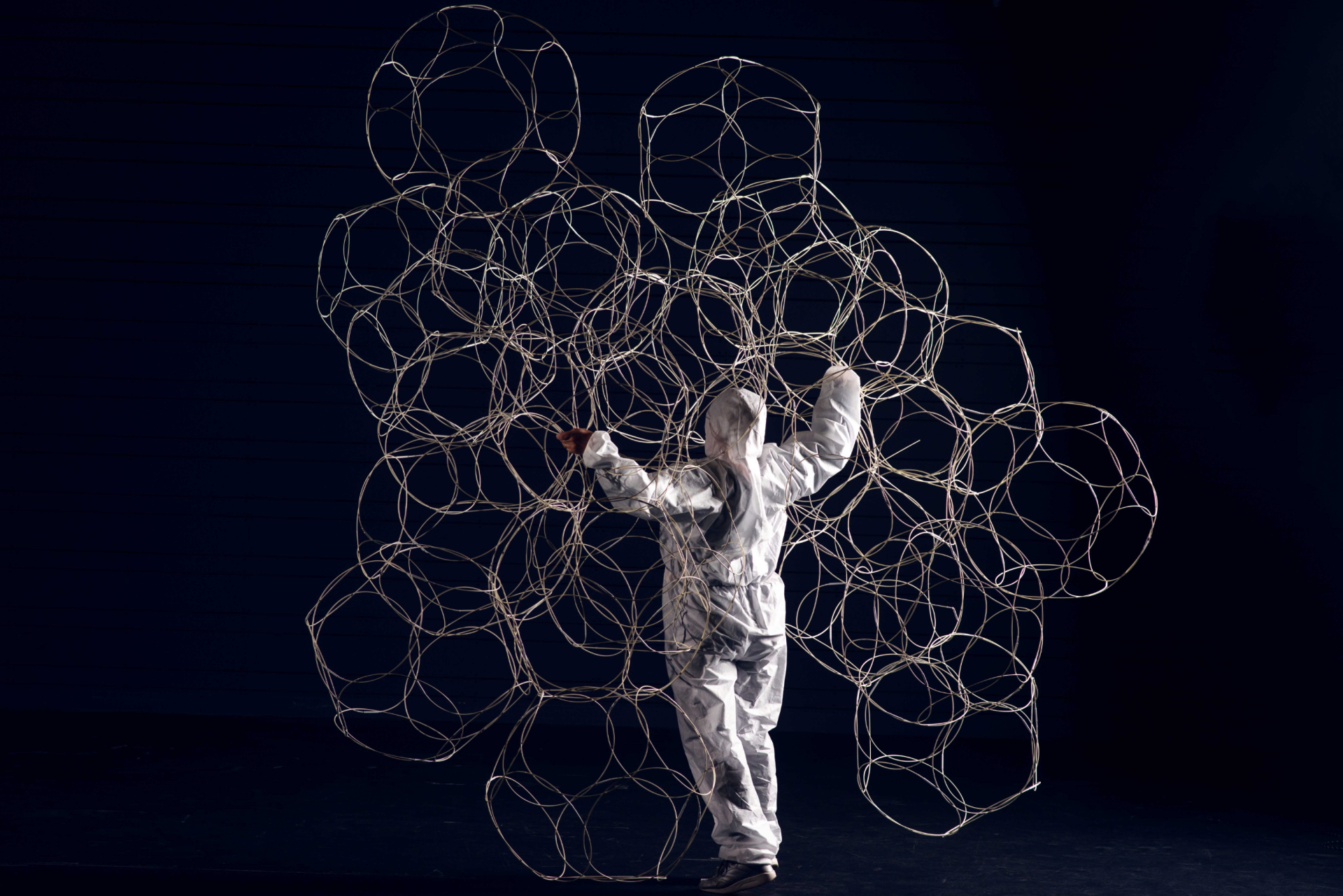 Ein übergreifender Ansatzpunkt für die Prozesse in meinem Promotionsprojekt war der Versuch, vom anthropozentrischen Zirkusmachen zu Praktiken überzugehen, die die nicht-menschlichen Kräfte in der Zirkuskomposition wesentlich berücksichtigen. Vor fünfzehn Jahren war ich eine Tänzerin und Akrobatin, die auf Stangen kletterte, sich an Seilen schwang, der Schwerkraft trotzte und extreme körperliche Leistungen vollbrachte. Auch wenn ich mich heute immer noch als Akrobatin bezeichne, dreht sich meine Zirkusdisziplin um „Objektmanipulation". Anstatt jedoch das Wort „Objekt" zu verwenden, bezeichne ich die Objekte als „Körper", um die Dichotomie Objekt/Subjekt zu überwinden. Eine Strategie, um aus einer weniger dominanten Haltung heraus zu arbeiten, war die Arbeit mit „Körpern", die nicht dem Zirkus angehören. Die „Körper", mit denen ich hauptsächlich gearbeitet habe, waren „Bubbles" (handgefertigte Kreise aus flexiblen Glasfaserstäben, die zu Ringen gebogen und zu einem Dodekaeder geflochten sind)8 und „Foil" (Stücke von Metallplatten, die ursprünglich als Sicherheitsdecken hergestellt wurden).