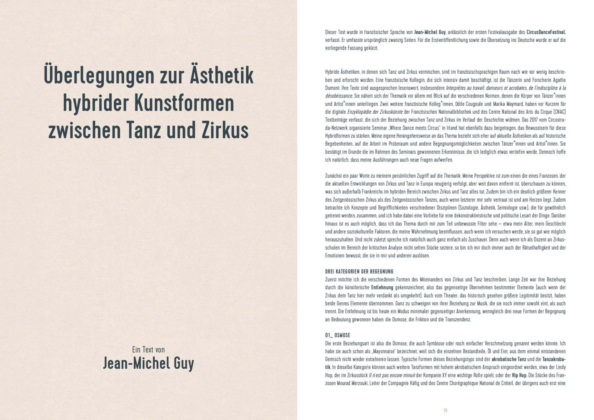Dieser Text wurde in französischer Sprache von Jean-Michel Guy, anlässlich der allerersten Festivalausgabe des CircusDanceFestival, verfasst. Er umfasste ursprünglich zwanzig Seiten. Für die Erstveröffentlichung sowie die Übersetzung ins Deutsche wurde er auf die vorliegende Fassung gekürzt.