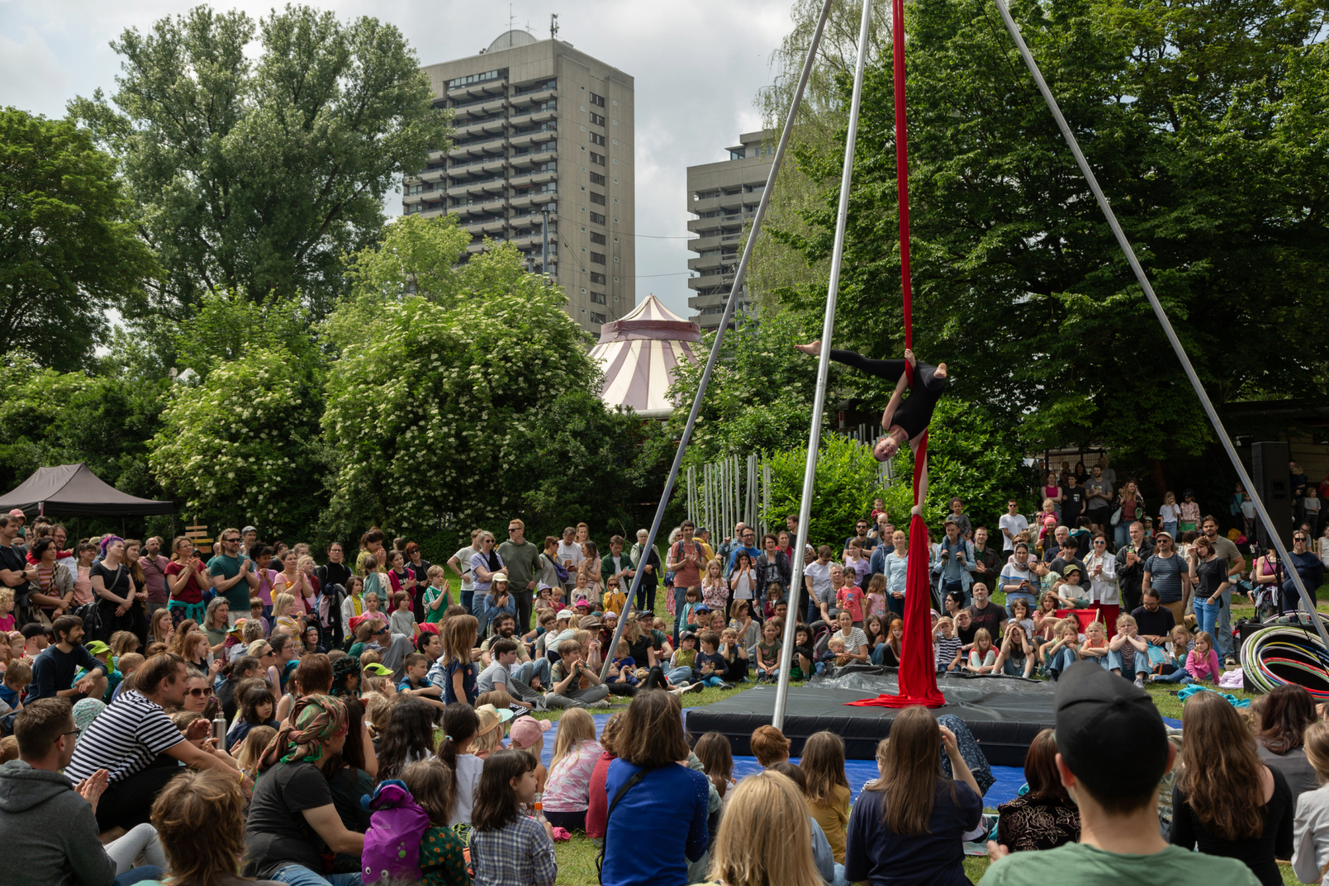 A day full of contemporary circus for the whole family - outside and for free! The CircusDanceFestival and LATIBUL invite young and old to the festival meadow to immerse themselves in the world of contemporary circus. Contemporary circus and children - do they go together? Absolutely! You can expect family-friendly productions, inspiring performances by child and youth artists, numerous workshops and hands-on activities. Enjoy the day together with a relaxed picnic on the meadow and indulge in the circus goings-on under the trees. The programme starts at 11.30 am. From artistic cycling by the reigning world champions to superheroines in the air and parent-child acrobatics on the meadow: There is something going on for everybody. The family programme transitions into the evening program at 6:00 PM with a joint dance-circus performance.