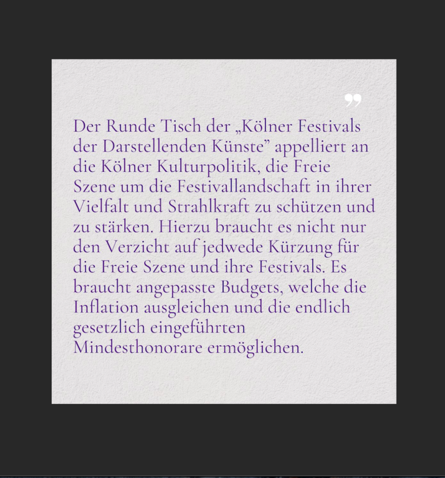 Statement der Kölner Festivals der darstellenden Künste zum Erhalt der Festivallandschaft in Köln