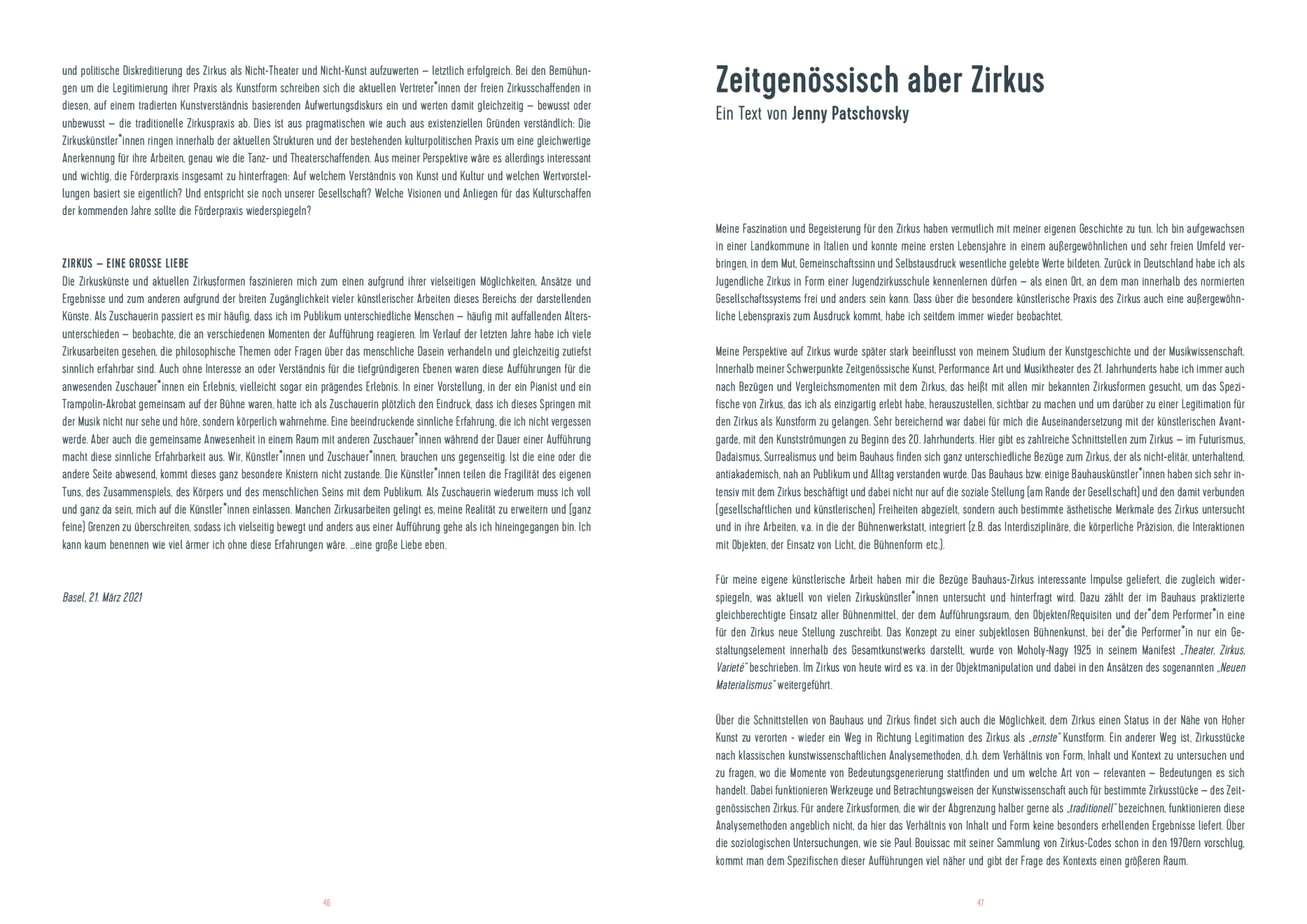 Meine Perspektive auf Zirkus wurde später stark beeinflusst von meinem Studium der Kunstgeschichte und der Musikwissenschaft. Innerhalb meiner Schwerpunkte Zeitgenössische Kunst, Performance Art und Musiktheater des 21. Jahrhunderts habe ich immer auch nach Bezügen und Vergleichsmomenten mit dem Zirkus, das heißt mit allen mir bekannten Zirkusformen gesucht, um das Spezifische von Zirkus, das ich als einzigartig erlebt habe, herauszustellen, sichtbar zu machen und um darüber zu einer Legitimation für den Zirkus als Kunstform zu gelangen. Sehr bereichernd war dabei für mich die Auseinandersetzung mit der künstlerischen Avantgarde, mit den Kunstströmungen zu Beginn des 20. Jahrhunderts. Hier gibt es zahlreiche Schnittstellen zum Zirkus – im Futurismus, Dadaismus, Surrealismus und beim Bauhaus finden sich ganz unterschiedliche Bezüge zum Zirkus, der als nicht-elitär, unterhaltend, antiakademisch, nah an Publikum und Alltag verstanden wurde. Das Bauhaus bzw. einige Bauhauskünstler*innen haben sich sehr intensiv mit dem Zirkus beschäftigt und dabei nicht nur auf die soziale Stellung (am Rande der Gesellschaft) und den damit verbunden (gesellschaftlichen und künstlerischen) Freiheiten abgezielt, sondern auch bestimmte ästhetische Merkmale des Zirkus untersucht und in ihre Arbeiten, v.a. in die der Bühnenwerkstatt, integriert (z.B. das Interdisziplinäre, die körperliche Präzision, die Interaktionen mit Objekten, der Einsatz von Licht, die Bühnenform etc.).