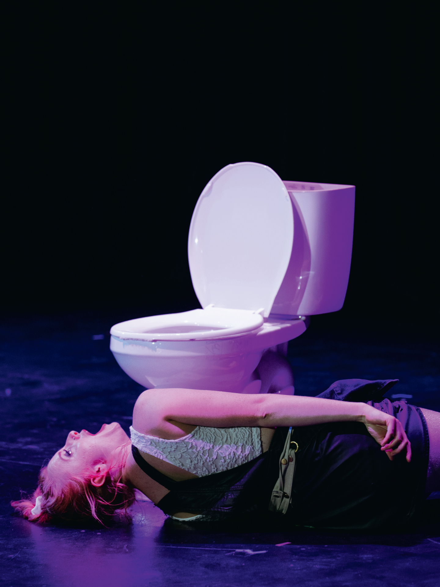 After discovering the pregnancy test is positive, Vooma invites the audience to a eulogy for her unborn selves. Vooma gathers all the flowers and, one by one, drops them into the toilet whilst considering her future selves: “I am 40 and have at least half of my student loans paid off.” “I am 55 and sleeping like a baby on a California king sized bed next to a woman who I am madly in love with.” Once the toilet bowl is overflowing with flowers of her future selves, she cradles the precious bouquet in her arms and smells them deeply. This poetic consideration of her choices, combined with her discovery of wild, uninhibited pleasure, transforms the space from a single stall bathroom into a cosmic space. Dancing in this chaos, her body expanded by the neon glow of blacklights, Vooma explores the possibilities of her past, present, and future selves. Brought back to reality by a knock at the door, she takes her flowers, and dances out of the bathroom, confident in her choice.