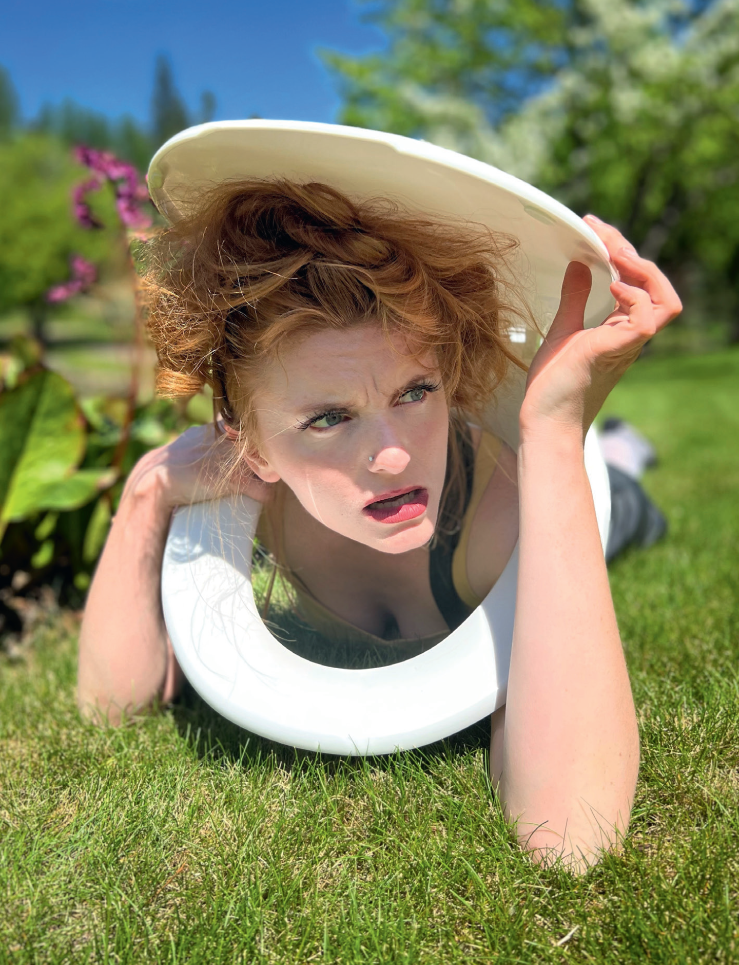 Towards the end of the play, Vooma discovers deep pleasure whilst embodying a venus fly trap. The plant has an insatiable hunger for flies (represented by shoes) and licks her lips voraciously whilst eyeing the footwear of the audience. Every time an audience member throws a shoe into her mouth (the toilet lid), she shouts, “I’M STILL HUNGRY”. This unapologetic pursuit of pleasure is a sharp contrast to previous scenes in the play, when Vooma’s inability to say what she wants prevents her from accessing pleasure. When everyone in the audience agrees to throws their shoes into her mouth, Vooma finally gets herself off, in a moment of delicious, joyful, chaos.