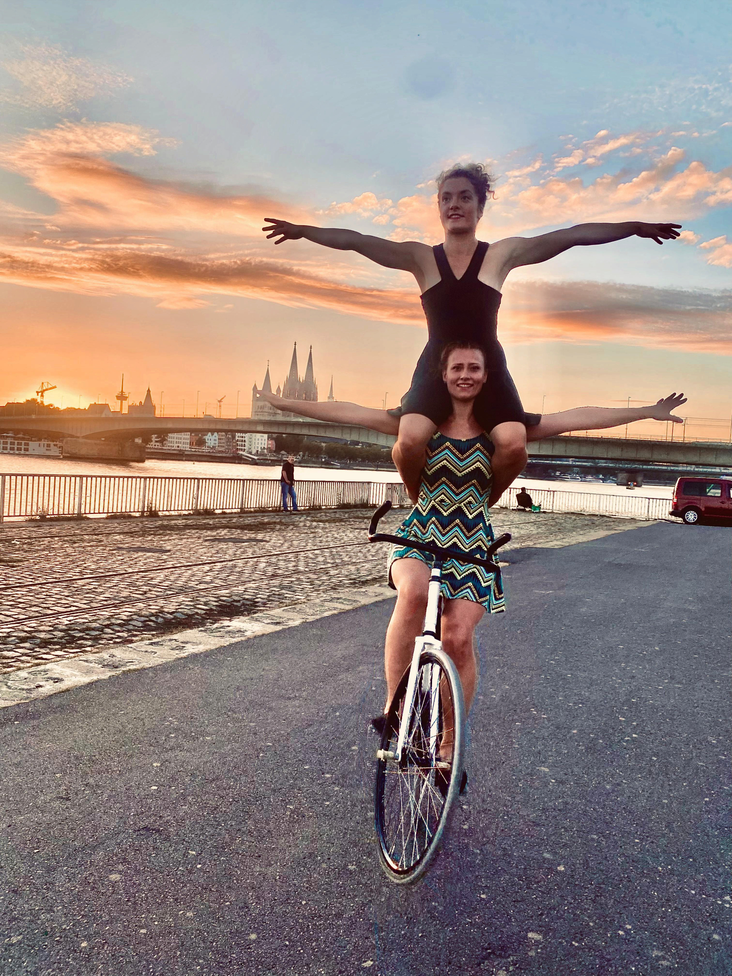 Fleuriane and Antonia are firmly convinced that the bicycle is more than just a means of transport. It is a way of life. For the reigning world champions in artistic cycling, however, the bicycle is above all the link between their wonderful friendship. ‘Planlos, aber nicht radlos’ is about the journey and not the destination, a journey of circling and turning. The two artists are constantly reinventing the wheel. Together.