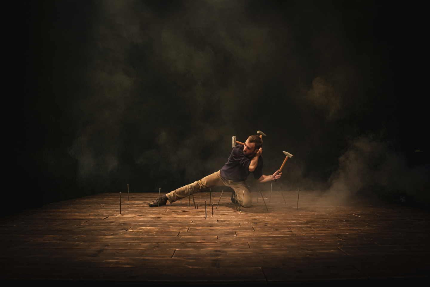 Handwerk trifft auf zeitgenössische Zirkuskunst: In SAWDUST SYMPHONY spielen drei gelernte Jongleure ihre Leidenschaft für Werkzeug, frisches Holz und Objektmanipulation aus. Das Stück erzählt vom menschlichen Verlangen nach Beschäftigung. Vom rauschhaften Visionieren bis hin zur Fertigstellung des Werkes spannt sich ein Bogen über die tragisch-komischen Beziehung zwischen Maschine, Mensch und Arbeit. Der Geruch von Sägespänen und Benzin erfüllt den Raum während drei besessene Individuen eine Gratwanderung zwischen Genugtuung und Frustration unternehmen und eine Heimwerker-Erfahrung der anderen Art kreieren.